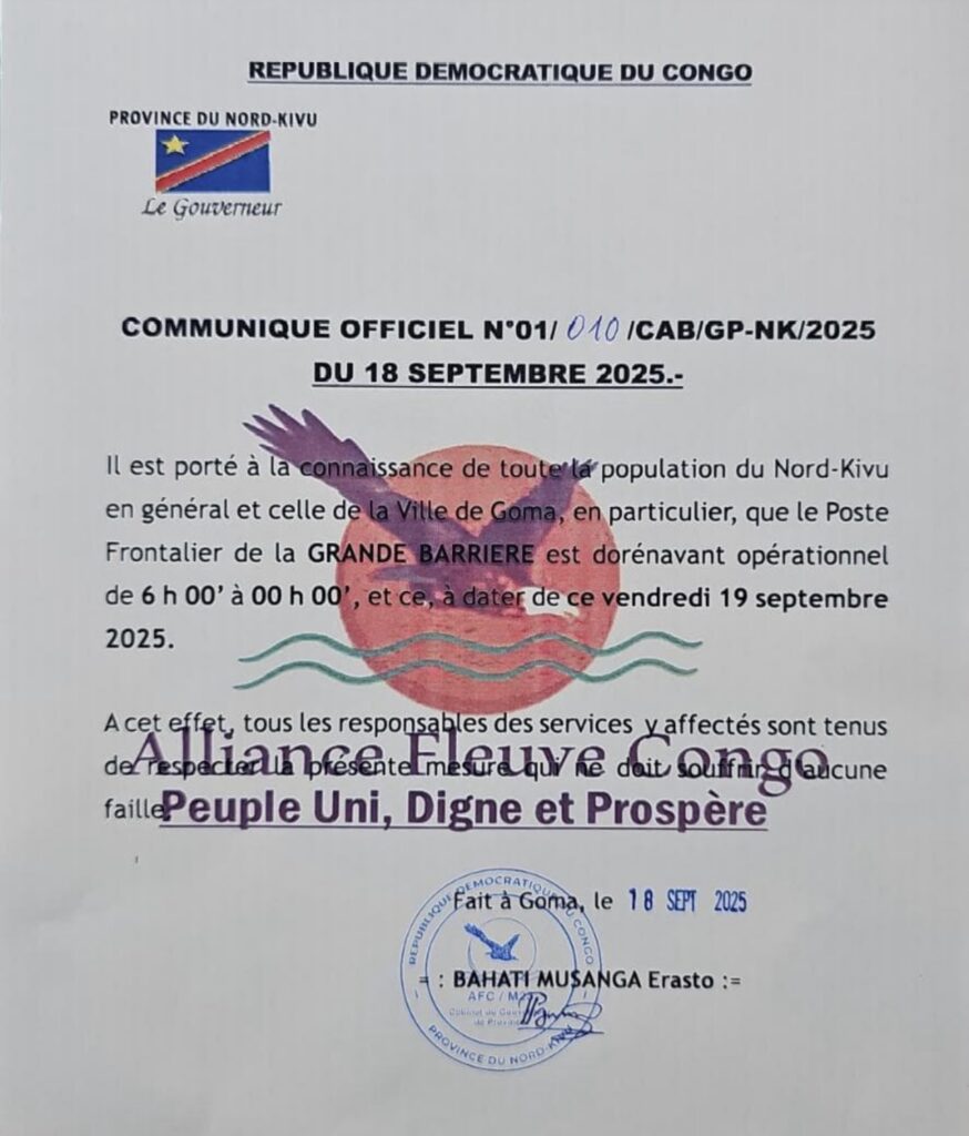 « Il est porté à la connaissance de toute la population du Nord-Kivu en général et de celle de la ville de Goma en particulier, que le poste frontalier de la Grande Barrière est dorénavant opérationnel de 6h00 à 00h00, et ce à partir du vendredi 19 septembre 2025 », indique le communiqué officiel consulté par Newsdrc.