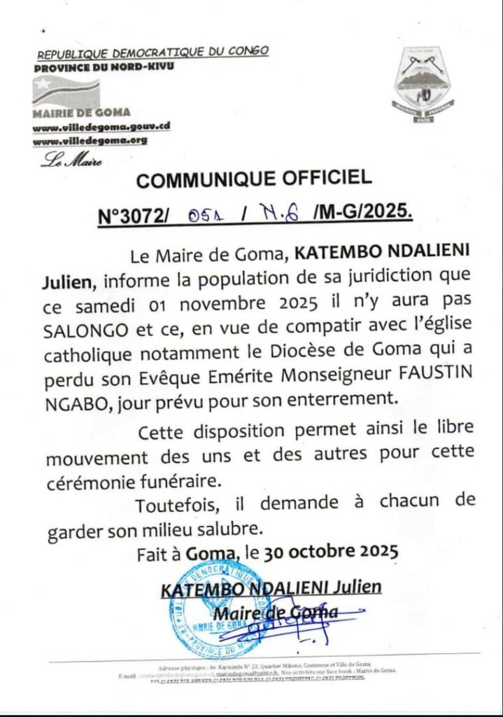 La Mairie de Goma a annoncé, à travers un communiqué officiel signé par le maire Julien Katembo Ndalieni, la suspension du Salongo prévu pour le samedi 1er novembre 2025. Cette décision vise à permettre à la population de prendre part librement aux funérailles de Mgr Faustin Ngabu, évêque émérite du diocèse de Goma.