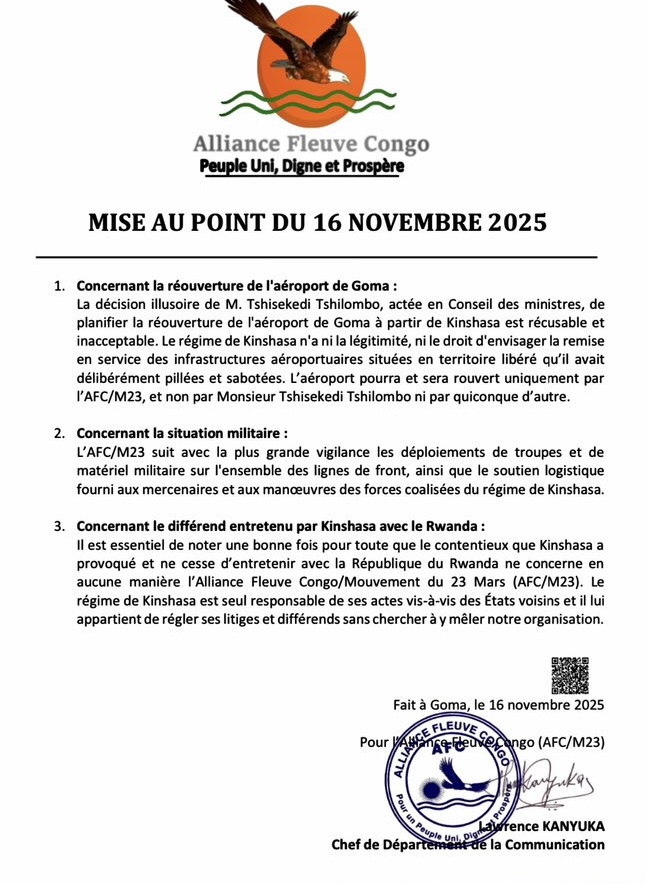 Dans une mise au point officielle rendue publique ce dimanche 16 novembre 2025, l’Alliance Fleuve Congo/M23 (AFC/M23) a vivement réagi à plusieurs décisions et déclarations récentes émanant du gouvernement de Kinshasa. Le mouvement, qui contrôle une large partie du Nord-Kivu, a notamment rejeté la planification de la réouverture de l’aéroport international de Goma annoncée depuis la capitale congolaise, dénoncé une intensification des opérations militaires adverses, et clarifié sa position concernant les tensions diplomatiques entre la RDC et le Rwanda.
