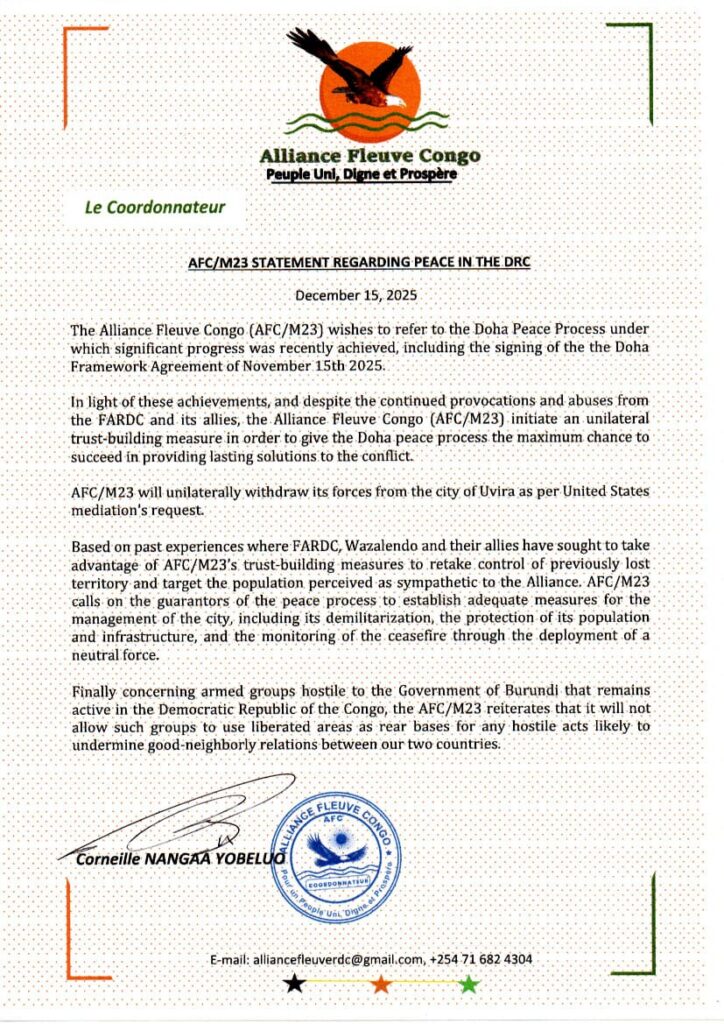 L’Alliance Fleuve Congo/M23 (AFC/M23) a fait savoir qu’elle se retirera unilatéralement de la ville d’Uvira, au Sud-Kivu, conformément à une requête issue de la médiation américaine. Présentée comme un geste de bonne volonté, cette décision est toutefois assortie de plusieurs exigences que le mouvement estime essentielles pour préserver la sécurité et éviter une nouvelle spirale de violences.