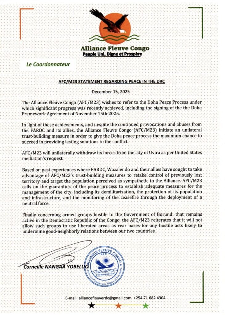 « Ce retrait constitue une mesure unilatérale de confiance destinée à donner toutes ses chances au processus de paix de Doha » , peut-on lire dans le communiqué signé par Corneille Nangaa Yobeluo, Coordonnateur politique de l’AFC/M23.
